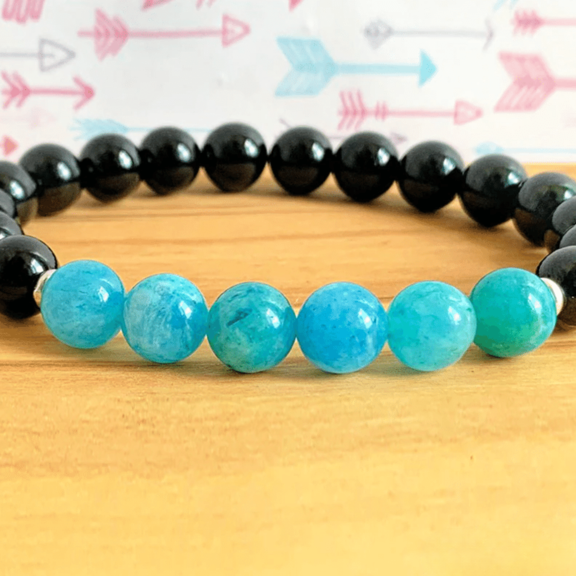 Black tourmaline is a stone of protection and confidence. It shields against negativity and promotes courage, self-assurance, loyalty, and prosperity. Paired with hemimorphite, known for soothing anger, sadness, and emotional tension, this bracelet helps restore calm communication and optimism.