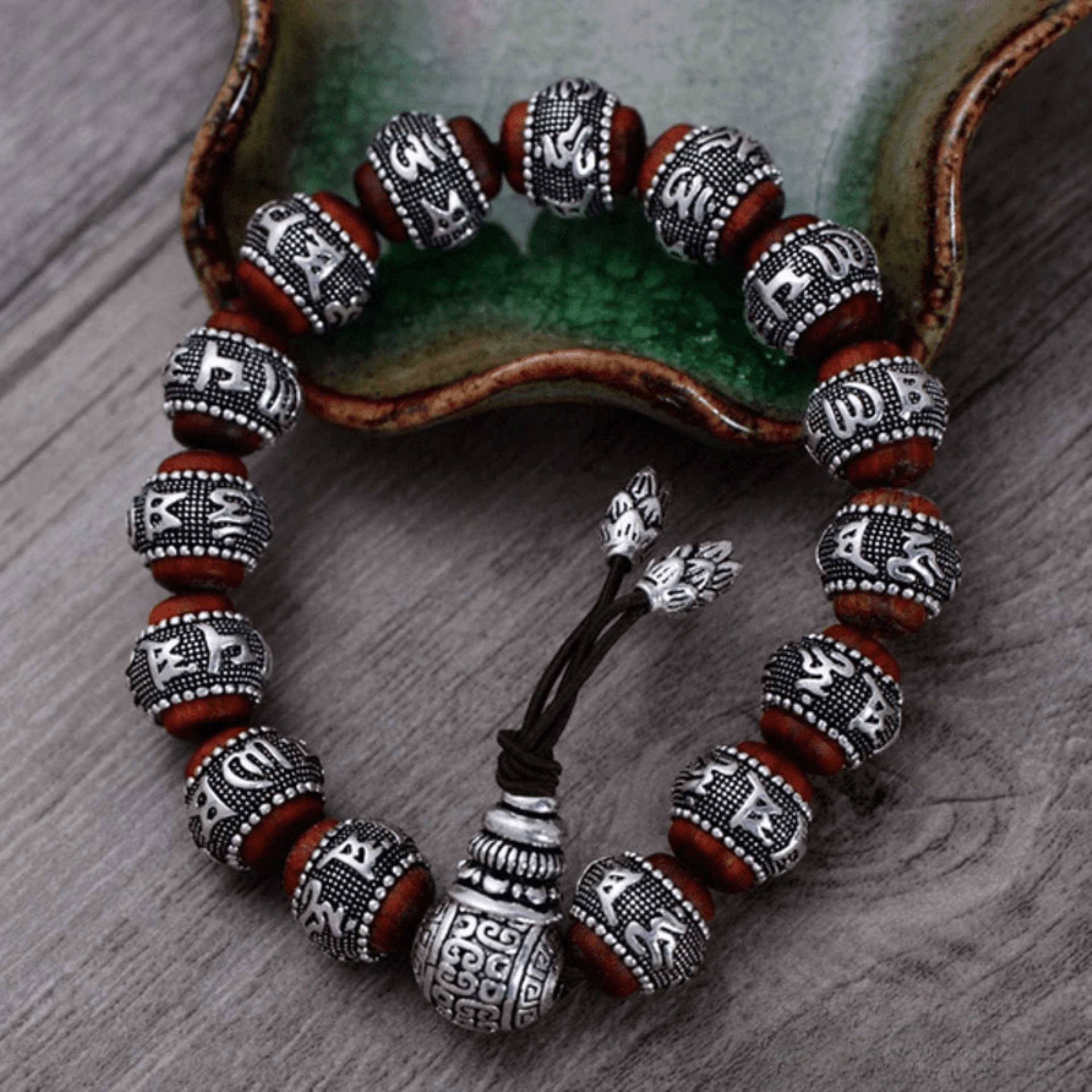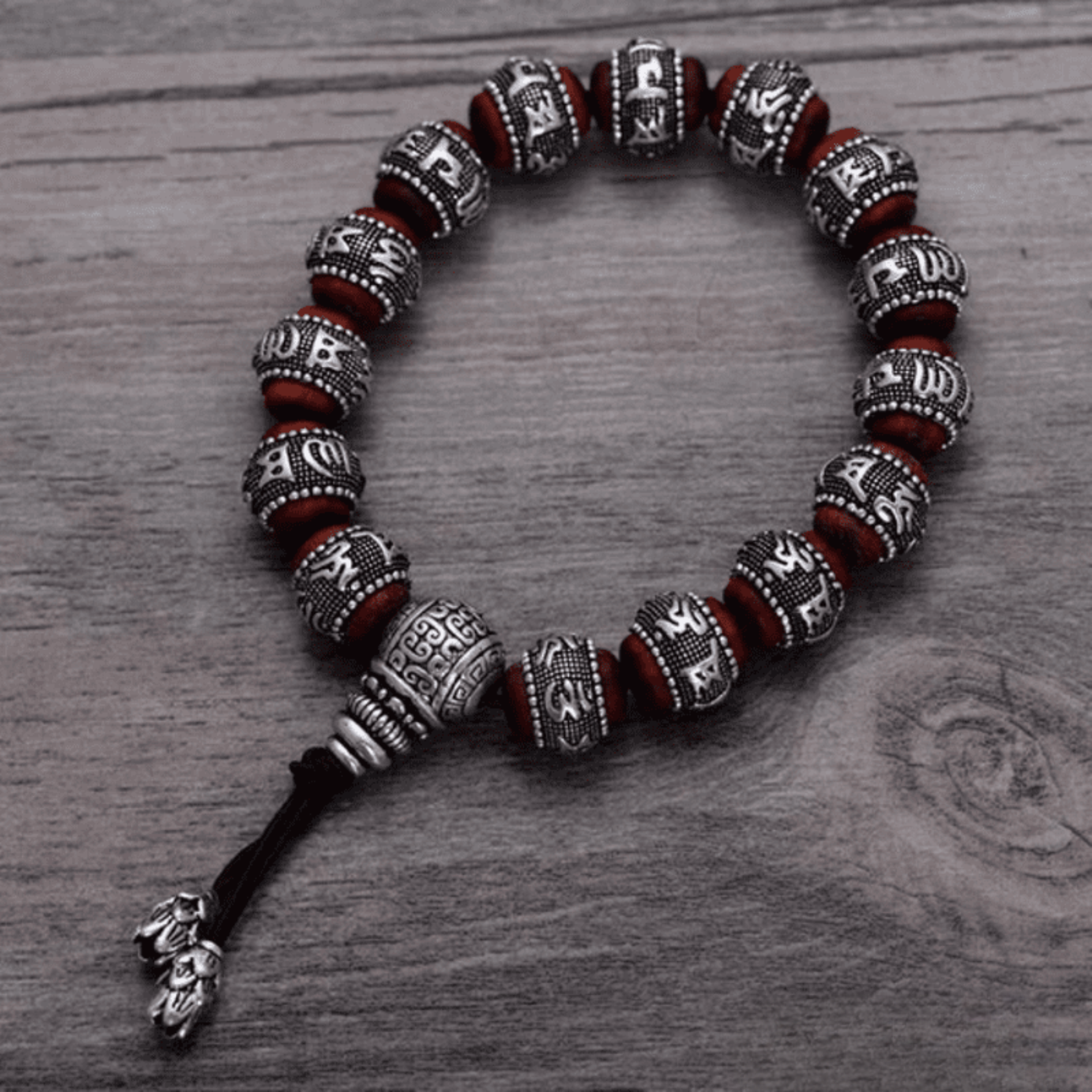 Elevate your style with our Tibetan solid silver bracelet, a refined piece traditionally handcrafted by Buddhist monks. This luxurious accessory combines 925 sterling silver with sacred Pterocarpus Santalinus beads, engraved with the powerful mantra “Om Mani Padme Hum.”